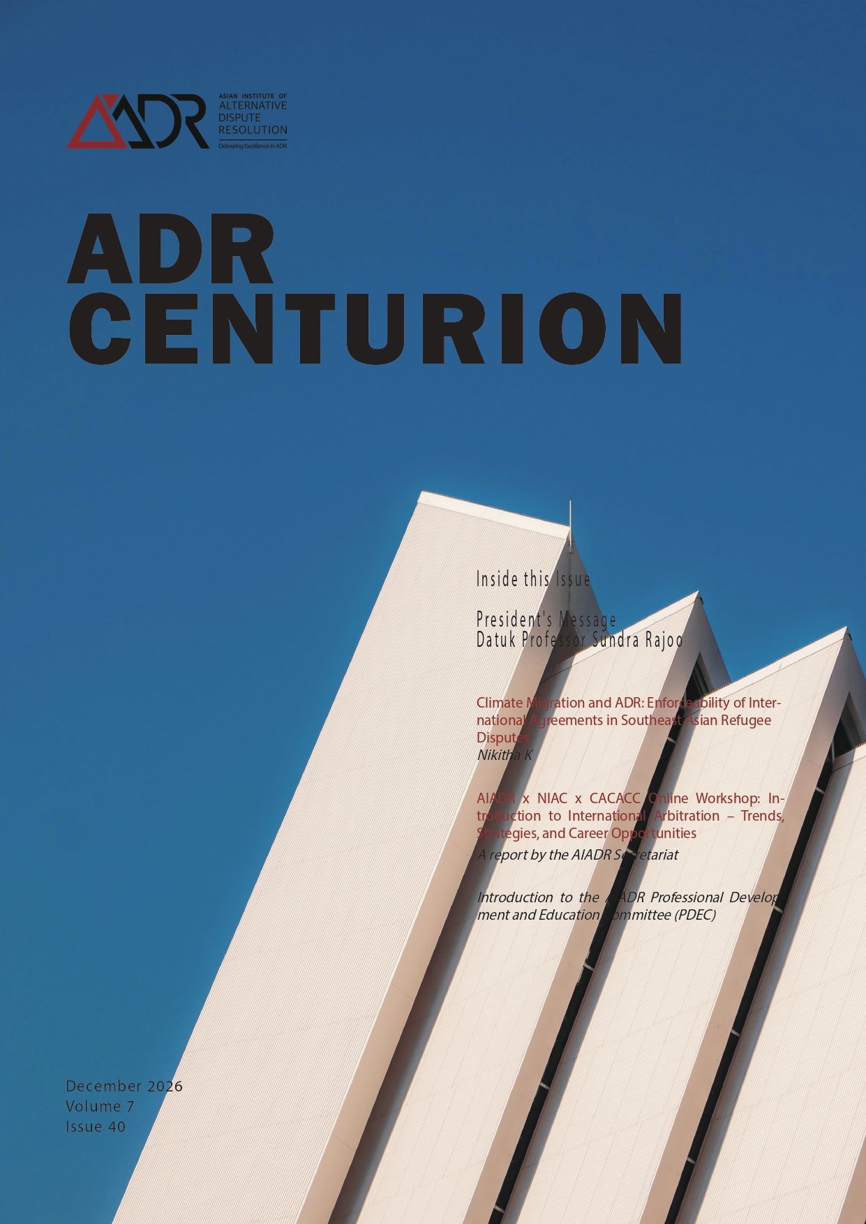 ADR Centurion Volume 7 Issue 40 aiadr website admin 01Feb Share Previous ADR Centurion Volume 6 Issue 39 December 1, 2025 Next International ADR Forum – AIADR Journal Volume 6 Issue 23 February 28, 2026 You Might Also Like 21May International Multi-Party, Multi-Contract and Supply Chain Arbitration No Comment 21May CABE Malaysia Annual Conference 2021 on Construction Collaboration No Comment 21May CSR & Code of Ethics in Supply Chain Arbitration Webinar No Comment 17Aug BREVI NOTA : Perspective on Anti-Arbitration Injunctions khenghoe No Comment 17Jun BREVI NOTA: The Extent of Court Intervention in Arbitration in Malaysia as a Model Law Jurisdiction khenghoe No Comment 23Mar BREVI NOTA: The Relevance of Arbitration in Resolving Disputes khenghoe No Comment